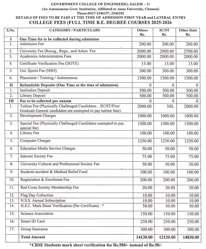 The Government College of Engineering, Salem, is a top-ranked institution in Tamil Nadu, known for its affordable education and high placement rates, particularly in the Metallurgy and Computer Science departments. Admission requires good higher secondary marks and participation in counseling through Anna University. The college offers engineering courses with a focus on academic excellence, supported by experienced faculty. Annual tuition fees are approximately Rs 4,470, and hostel fees are Rs 11,150, with total fees under Rs 1 lakh for a four-year program, making it more affordable than private colleges.