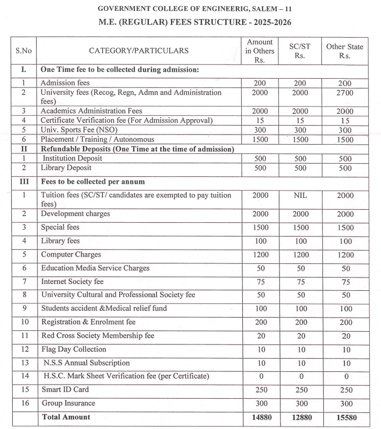 GCE Salem Hostel Fee for Male is ₹ 14,150. Hostel Fee for Female at GCE Salem is ₹ 14,050.