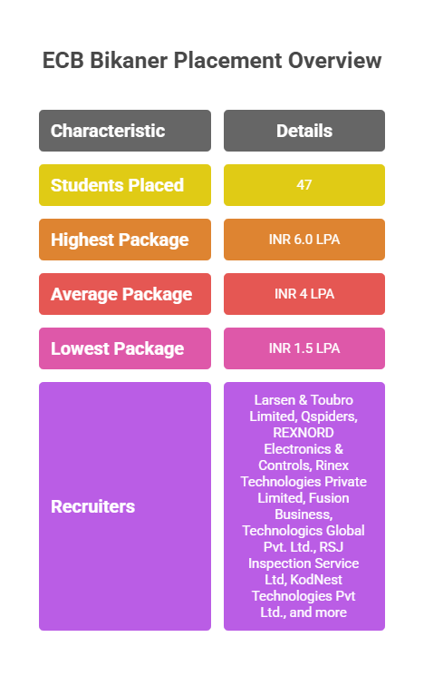 ECB Bikaner 2025 report has not been released yet. However, in 2023-24, 47 students were placed. The highest package offered is INR 6 LPA by Larsen & Toubro Limited, the average package offered is INR 4 LPA, and the lowest package is INR 1.5 LPA. The recruiters are Qspiders, REXNORD Electronics & Controls, Rinex Technologies Private Limited, Fusion Business, Technologics Global Pvt. Ltd., RSJ Inspection Service Ltd, KodNest Technologies Pvt Ltd., and more.