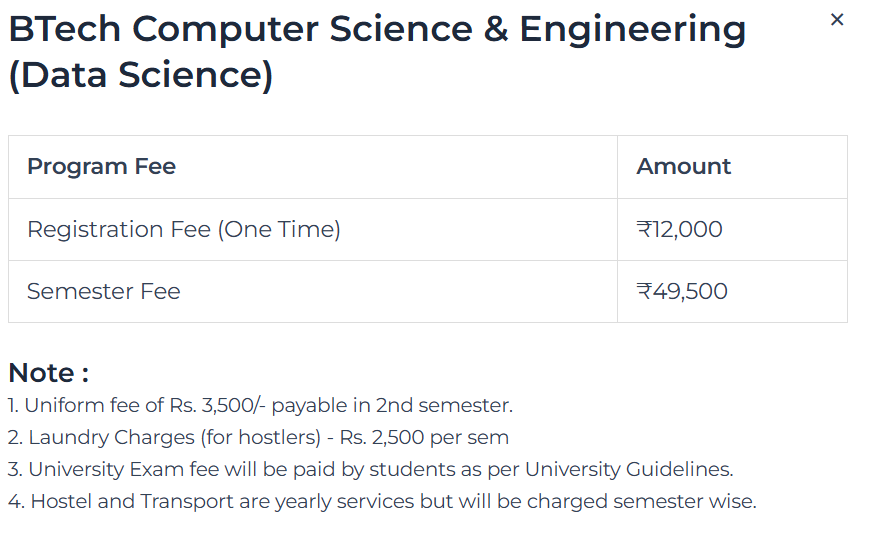 25 Feb, 2026 Gulzar Group of Institutes Ludhiana has released the Fee structure 2026-27 for B.Tech Computer Science and Engineering - Data Science programs. The total academic fee is ₹ 4.12 Lakhs.