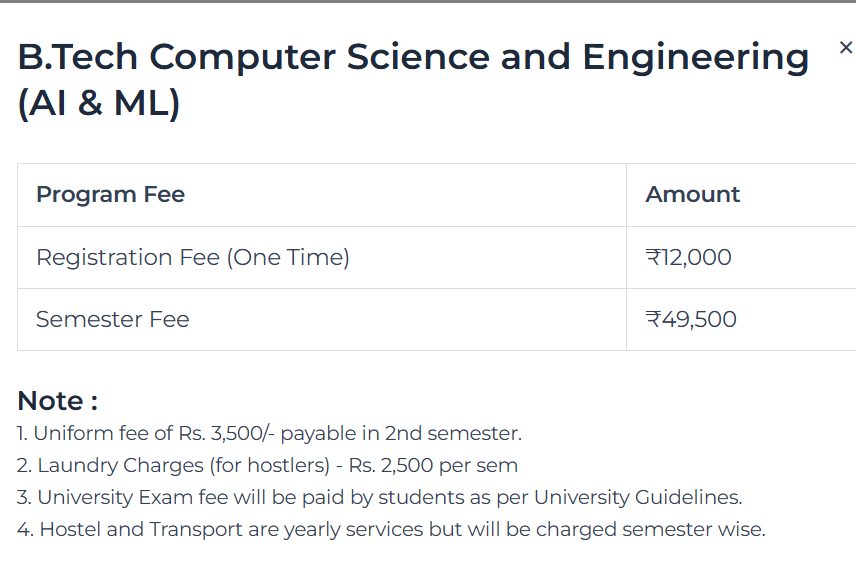 | Semester Wise Fees | 61500 | 53000 | 49500 | 49500 | 49500 | 49500 | 49500 | 49500 |