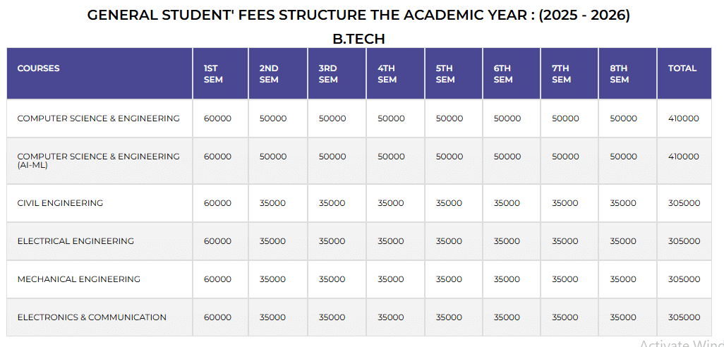 | Fees (2025 - 2026) | Year 1 (in INR) | Year 2 (in INR) | Year 3 (in INR) | Year 4 (in INR) | ||||