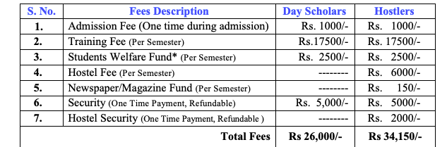The hostel comprises 15 rooms per floor across three floors, offering well-ventilated and hygienic accommodations. It provides 24/7 hot and cold water supply. Accommodation is available for boys with a fee of INR 6150 per semester and a one-time security deposit of INR 2000. Rooms house three students each. Separate hostels are provided for boys and girls.