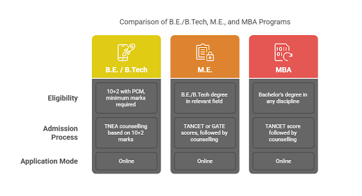 | Admission Process | B.E./B.Tech. Tamil Nadu Engineering Admissions (TNEA) counseling varies for PG degrees |