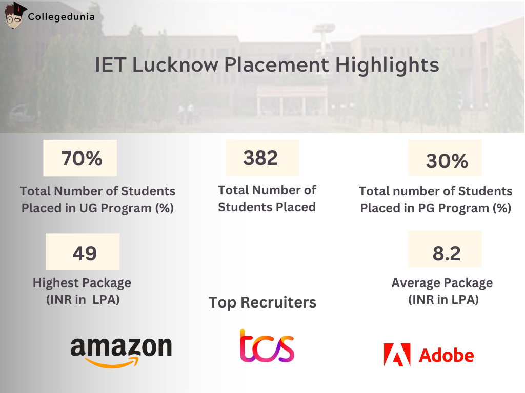 IET Lucknow placement report for 2025 has not been released yet. As per the placement report 2024, the highest package was INR 49 LPA, and the average package was INR 8.2 LPA. A total of 70% of students from the UG program were placed. Some of the top recruiters are Hero, Amazon, Adobe, Lava, Honda, Tech Mahindra, and Unacademy, among others.