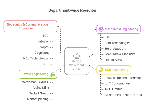 Jawahar Lal Nehru Engineering College has varied placement opportunities depending on the branch. The Textile Engineering department boasts the highest placement rate at approximately 100%, with graduates receiving packages reaching up to 12-18 lakh per annum. Electronics and Communication Engineering (ECE) also shows a promising placement record with around 33% placement and packages up to 22 lakh per annum. However, Civil and Mechanical Engineering departments have significantly lower placement rates, around 10% and 20% respectively, with limited opportunities in core companies.