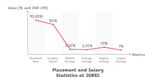 JSREC has not yet released official placement stats for 2025, available data and user reviews from 2024–2025 and earlier shows that 80% of students secure placements via campus drives. The highest package offered to the students was INR 10 LPA. As per latest NIRF report 2024, the median package of INR 3.25 LPA was secured in 2023. Typical recruiters include TVS, Wipro, TCS, Infosys, Saint‑Gobain, Byju's, Zoho, ESAF, Hexaware, VVDN, Bull, Nissi, Codilar and others.