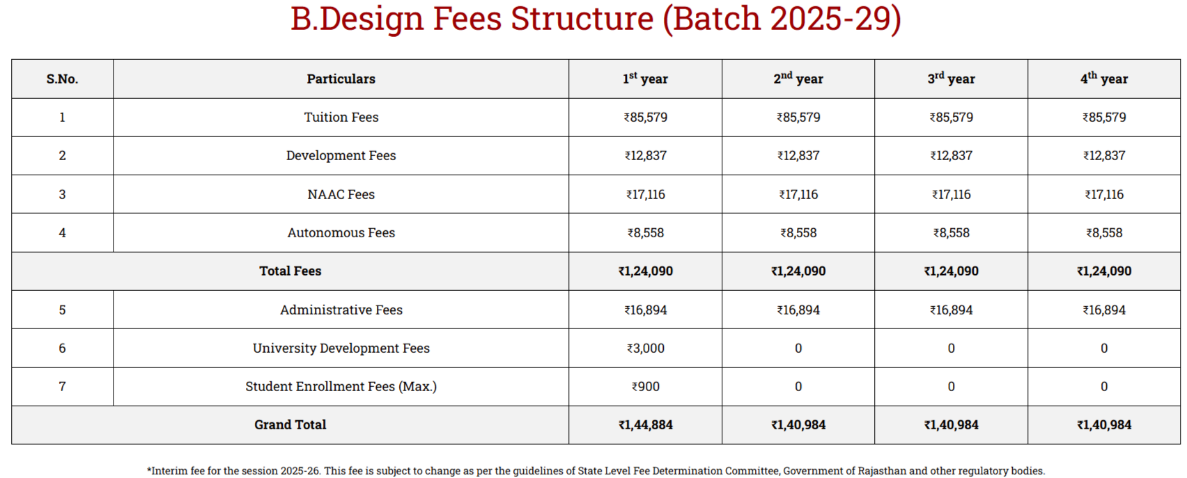 | Fees (2025 - 2026) | Year 1 (in INR) | Year 2 (in INR) | Year 3 (in INR) | Year 4 (in INR) |