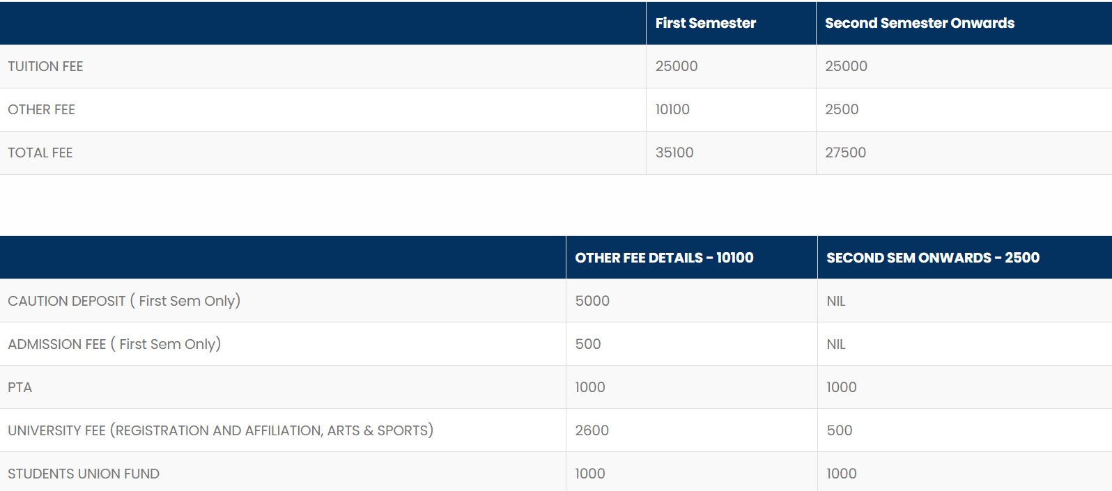 | Semester Wise Fees | ₹35100 | ₹27500 | ₹27500 | ₹27500 |