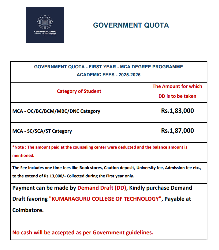 About 90% of students secure placements in top companies, with an average package of 5 LPA and a highest package of 45 LPA. The MCA program fee for TANCET students is 138,000 INR per year, with the total course fee amounting to 900,000 INR, covering various fees. First-generation graduates receive fee concessions, and loan facilities are available. The college updates its syllabus to align with industry trends, provides internships with stipends, and offers projects and skill-enhancing opportunities like hackathons and workshops.