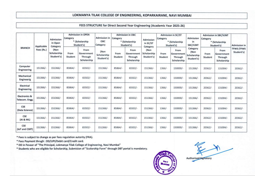 BE {Lateral} Mechanical Engineering at Lokmanya Tilak College of Engineering Navi Mumbai is a 3 Years Degree. The course is offered On Campus as a Full Time program. Lokmanya Tilak College of Engineering Navi Mumbai BE {Lateral} Mechanical Engineering First Year Fees is INR 1,51,366 for 2025.