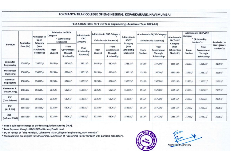 The Lokmanya Tilak College of Engineering offers a merit-based admission process through the Centralized Admission Process (CAP) rounds, requiring application via the online DTE Maharashtra platform. The application fee is Rs. 500 for general candidates and Rs. 400 for reserved categories. The college supports linguistic minority quotas and admits diploma holders directly into the second year. Tuition fees are approximately Rs 124,000 annually for open category students, with OBC and EBC students paying about Rs 65,000 to Rs 66,000.