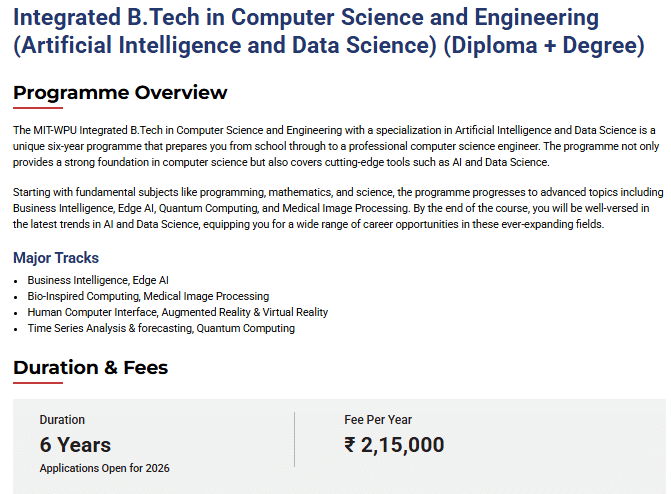 Earlier, Diploma + B.Tech Artificial Intelligence & Data Science fees at MITWPU of Engineering Pune was ₹ 11.7 Lakhs (in 2025) for the entire course duration. This shows that the fee has remained unchanged since 2025.