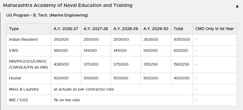 Earlier, B.Tech Marine Engineering fees at Maharashtra Academy of Naval Education and Training Pune was ₹ 10.54 Lakhs (in 2025) for the entire course duration. This shows a fee increase of ₹ 4.02 Lakhs over the year.