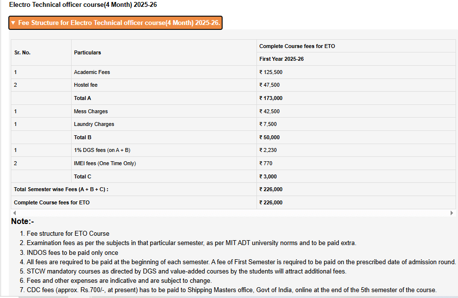 Maharashtra Academy of Naval Education and Training Pune Certification Electro Technical Officer is offered as 4 Months Full Time program, with total intake of 50 seats. The minimum eligibility criteria for Certification is 10+2 with 50%. The total fees for Maharashtra Academy of Naval Education and Training Pune Certification Electro Technical Officer in 2025 is ₹ 1.26 Lakhs for the complete course duration.