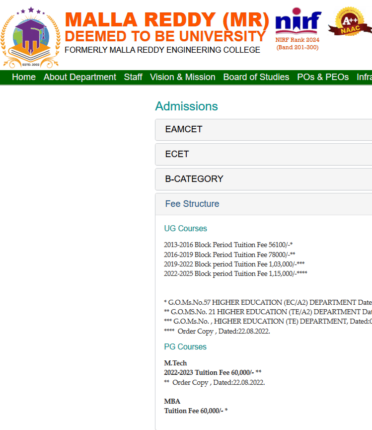 The fee structure varies; students entering through the TS-EAMCET exam pay a reduced annual tuition of 80,000 INR after a government scholarship. Management seat students pay 10 to 12 lakhs over four years. Additional fees include admission fees of 14,000 INR and semester fees of 1,520 INR. Economically disadvantaged students and those from SC/ST categories can receive full fee reimbursement, while OBC students are eligible for a 35,000 INR scholarship.
