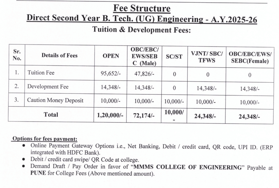 Earlier, BE {Lateral} Electronics & Telecommunication Engineering fees at MMCOE Pune was ₹ 2.63 Lakhs (in 2024) for the entire course duration. This shows a fee increase of ₹ 77,044 over the year.