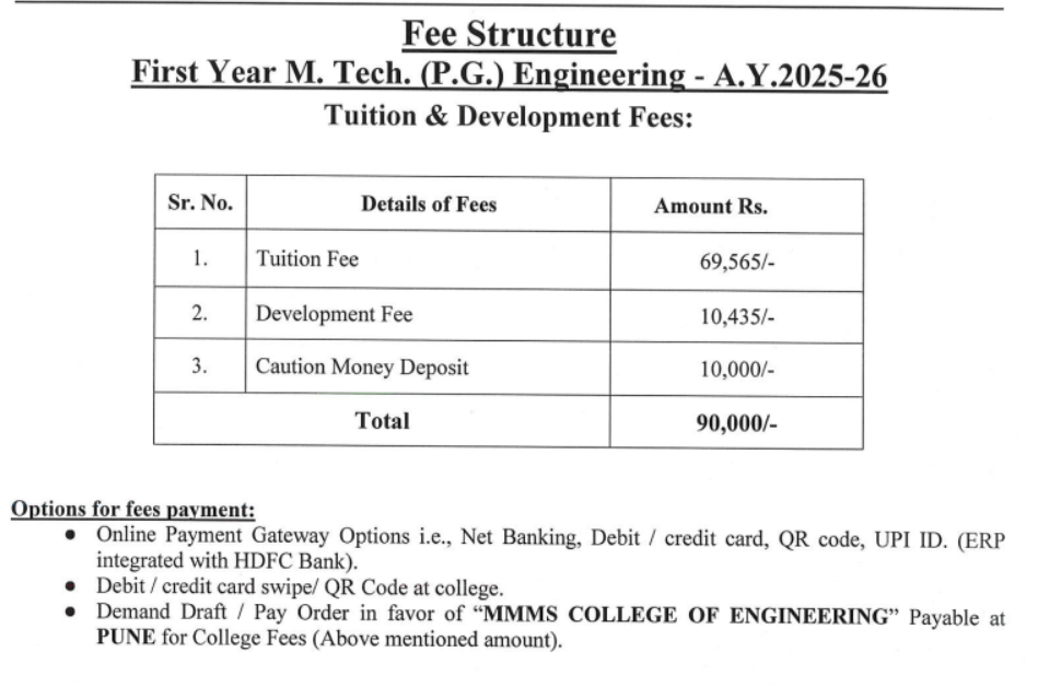 Earlier, M.Tech Embedded System and VLSI Design fees at MMCOE Pune was ₹ 1.27 Lakhs (in 2024) for the entire course duration. This shows a fee increase of ₹ 43,303 over the year.