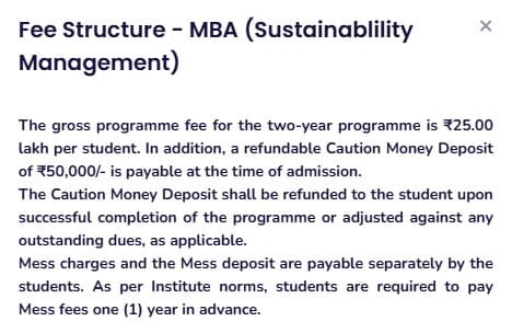 Earlier, MBA Sustainability Management fees at IIM Mumbai was ₹ 21 Lakhs (in 2025) for the entire course duration. This shows a fee increase of ₹ 4.5 Lakhs over the year.