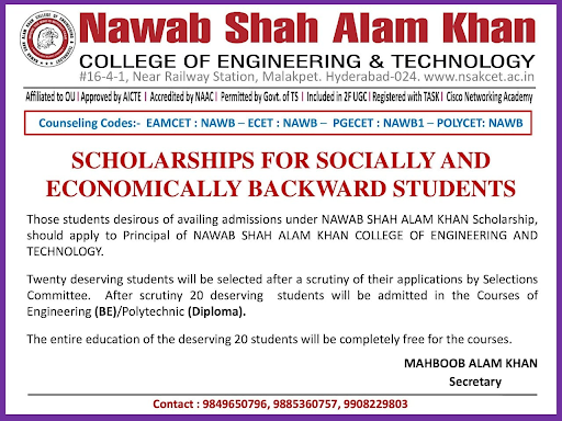 NSAKCET Hyderabad offers scholarships to deserving students. Although the official website of NSAKCET Hyderabad does not specify the eligibility of students for scholarships, there seem to be three types of scholarships that students can explore: