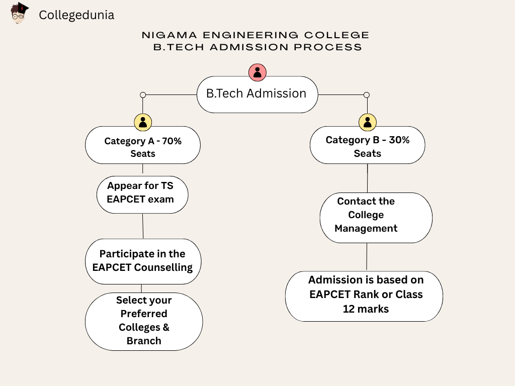 - There are two categories of admissions in this college. The category A with 70% admission is through the TS EAPCET. The students must pass class 12 with a minimum of 45%, and must qualify for the EAPCET exam, participate in the EAPCET counselling process, and select Nigama Engineering College as one of their preferences. Admission is based on the rank, category, and preferences.