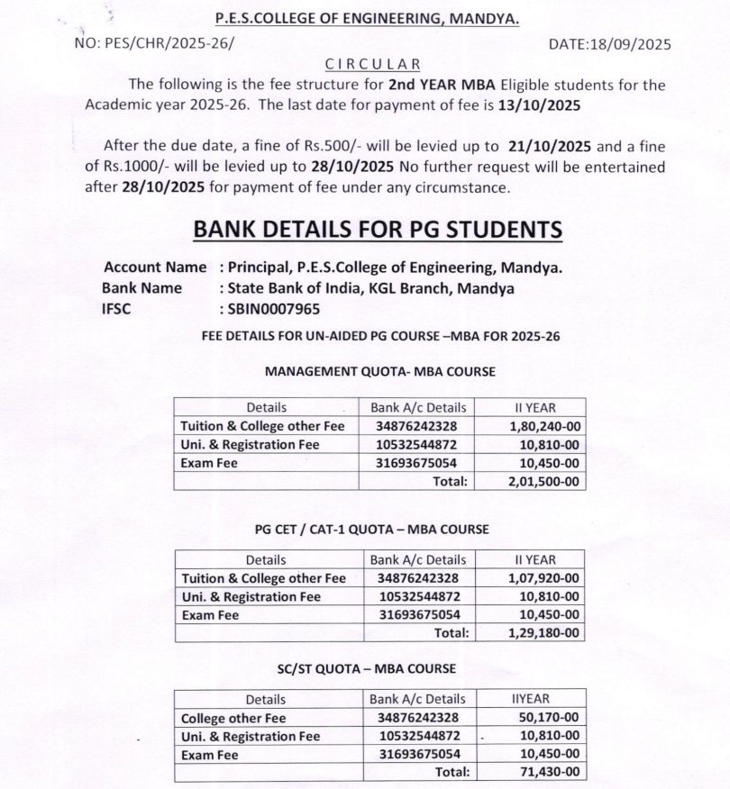 The minimum eligibility for admission to MBA at PESCE is Graduation. Candidates are allotted seats based on Karnataka-PGCET.