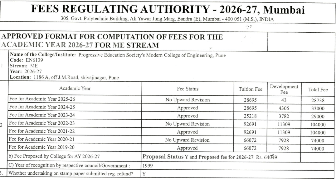 Earlier, M.Tech Signal Processing fees at Progressive Education Society's Modern College of Engineering Pune was ₹ 61,695 (in 2025) for the entire course duration. This shows a fee increase of ₹ 66,403 over the year.