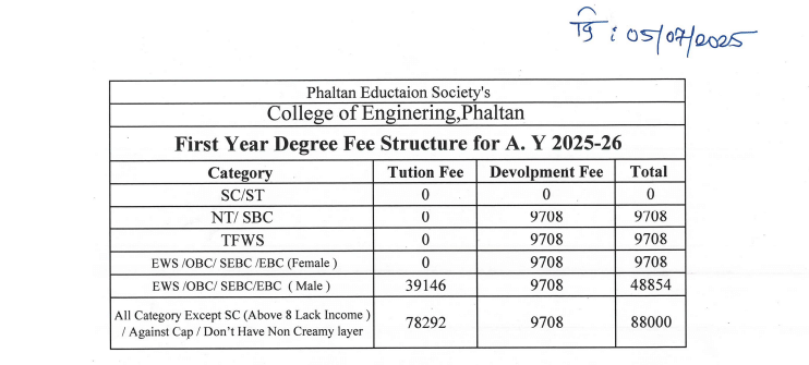 Phaltan Education Society's College of Engineering Satara BE Electronics & Telecom Engineering is offered as 4 Years Full Time program, with total intake of 30 seats. The minimum eligibility criteria for BE is 10+2. The total fees for Phaltan Education Society's College of Engineering Satara BE Electronics & Telecom Engineering in 2025 is ₹ 3.23 Lakhs for the complete course duration, which includes total tuition fees of ₹ 3.13 Lakhs. Earlier, the fees in 2023 - 2024 for BE Electronics & Telecom Engineering was ₹ 3.4 Lakhs.
