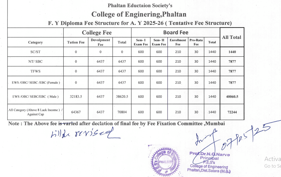 Phaltan Education Society's College of Engineering Satara Polytechnic Mechanical Engineering is offered as 3 Years Full Time program, with total intake of 90 seats. The minimum eligibility criteria for Polytechnic is 10th pass. The total fees for Phaltan Education Society's College of Engineering Satara Polytechnic Mechanical Engineering in 2025 is ₹ 2 Lakhs for the complete course duration, which includes total tuition fees of ₹ 1.93 Lakhs. Earlier, the fees in 2021 - 2022 for Polytechnic Mechanical Engineering was ₹ 1.8 Lakhs.