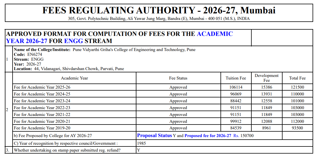 Scholarships are available for students from families with lower incomes, with the Tuition Fee Waiver Scheme significantly reducing fees. The Economically Backward Class scholarship refunds half of the tuition fees for eligible open category students. The Krutika Scholarship offers Rs. 50,000 and a job offer to the top-performing third-year female Electrical student. The college is centrally located in Pune near Swargate, and despite being small, it offers facilities like on-campus bank offices.
