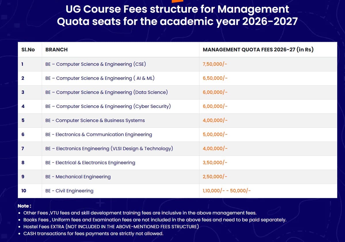 40,000 to Rs. 58,880 per annum, COMEDK students pay approximately Rs. 160,000 to Rs. 200,000, and management quota fees range from Rs. 2.5 lakh to Rs. 4 lakh, depending on the department. Hostel charges are about Rs. 40,000 annually, plus Rs. 3,000 monthly for mess. The college boasts a strong placement record, with 95% of eligible Computer Science Engineering students getting placed. The highest salary package reached INR 66 LPA, while the average ranges from INR 4 to 8 LPA.
