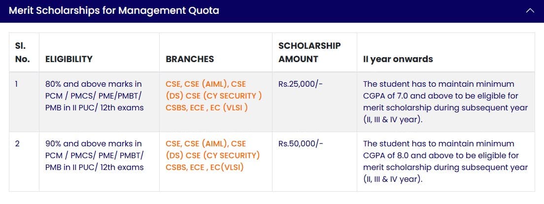 Top recruiters include Amazon and Infosys. Internship stipends range from INR 5,000 to INR 50,000 per month. Scholarships are mainly through government schemes, favoring Karnataka students, with limited options for others. Loans are facilitated, though not commonly from the college bank.