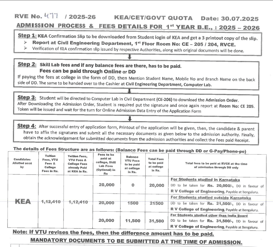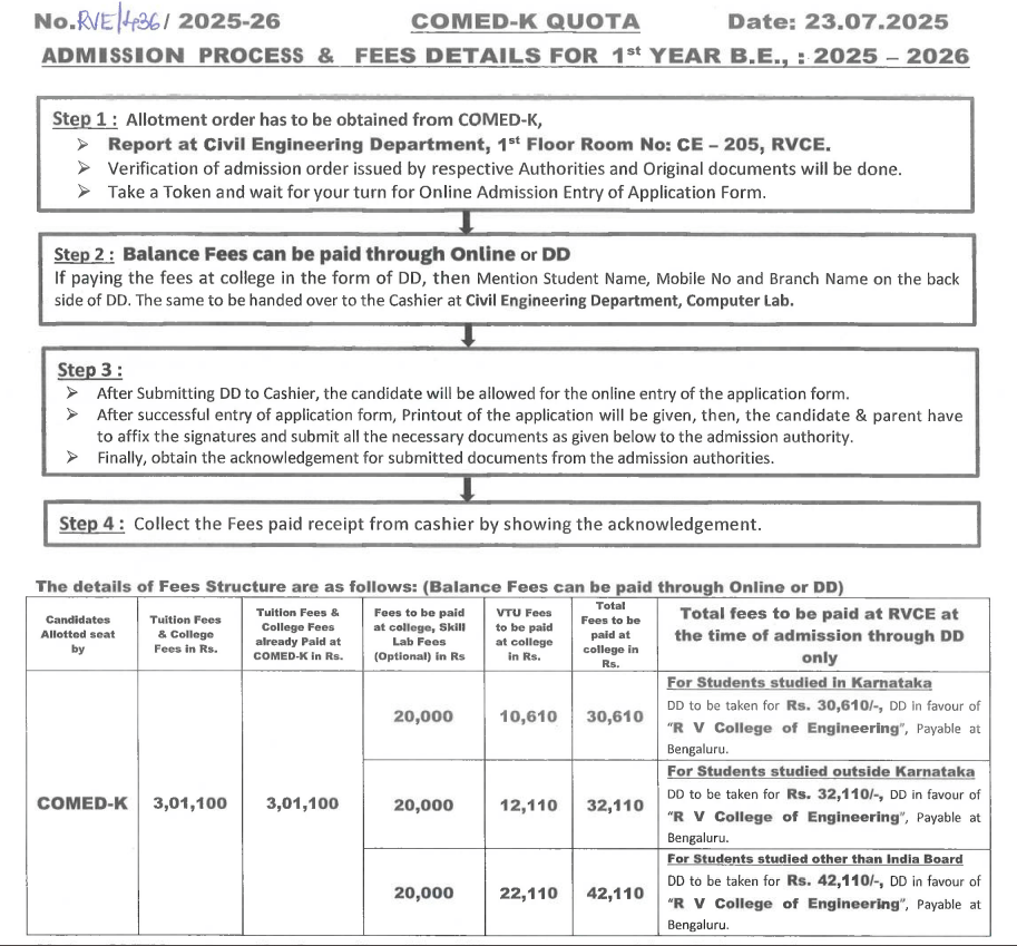 Fees vary with admission mode: CET students pay around Rs. 1 lakh per year, COMEDK students between Rs. 2.5 lakh to Rs. 3 lakh, and management quota fees for CSE are about Rs. 10 lakh per year. Hostel fees are about Rs. 1.5 lakh annually. Scholarships are available, with financial aid reaching up to Rs. 1.5 lakh for eligible students. RVCE has an outstanding placement record, with over 250 companies visiting yearly and a placement rate of 85-90%, sometimes exceeding 100% due to multiple offers.