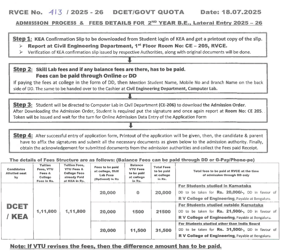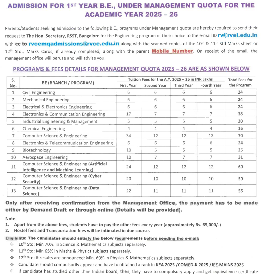 Earlier, BE {Lateral} Chemical Engineering fees at RVCE was ₹ 3.2 Lakhs (in 2024) for the entire course duration. This shows a fee increase of ₹ 6.8 Lakhs over the year.