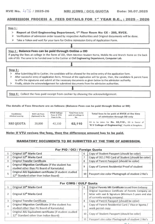 For students applying under the NRI quota for admission, the total course fee for BE {Lateral} Chemical Engineering at RVCE is ₹ 1.86 Lakhs.