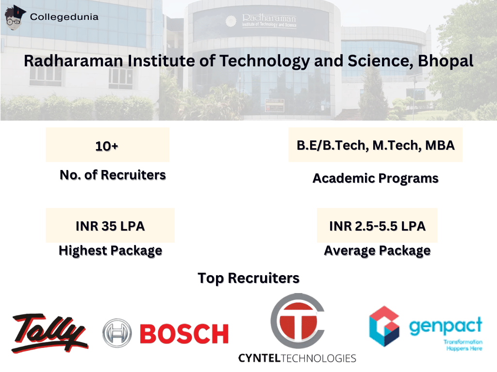As per the recent reviews by students on collegedunia website many companies offer direct recruitment from the campus of Radharaman Institute of Technology and Science, Bhopal. Highest package is up to INR 35 LPA and average package ranging between INR 2.5-5.5 LPA by companies like TCS,Infosys, Genpact, Tally solution, Syntel Bosch, Mahindra etc. are amongst the top recruiters.