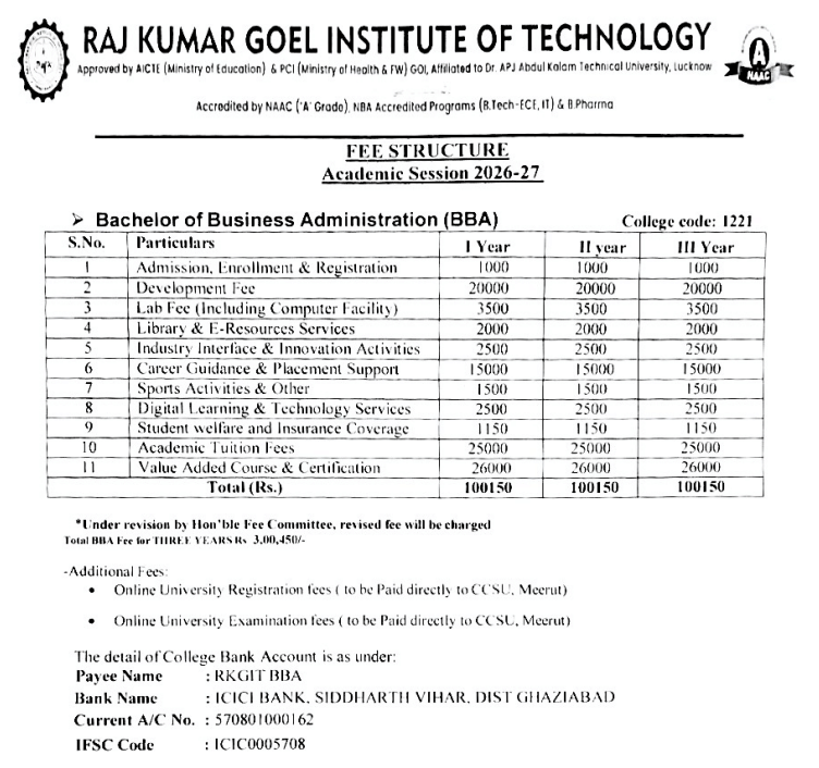 BBA at RKGIT is a 3 Years Degree. The course is offered On Campus as a Full Time program. RKGIT BBA First Year Fees is INR 4,01,500 for 2025.