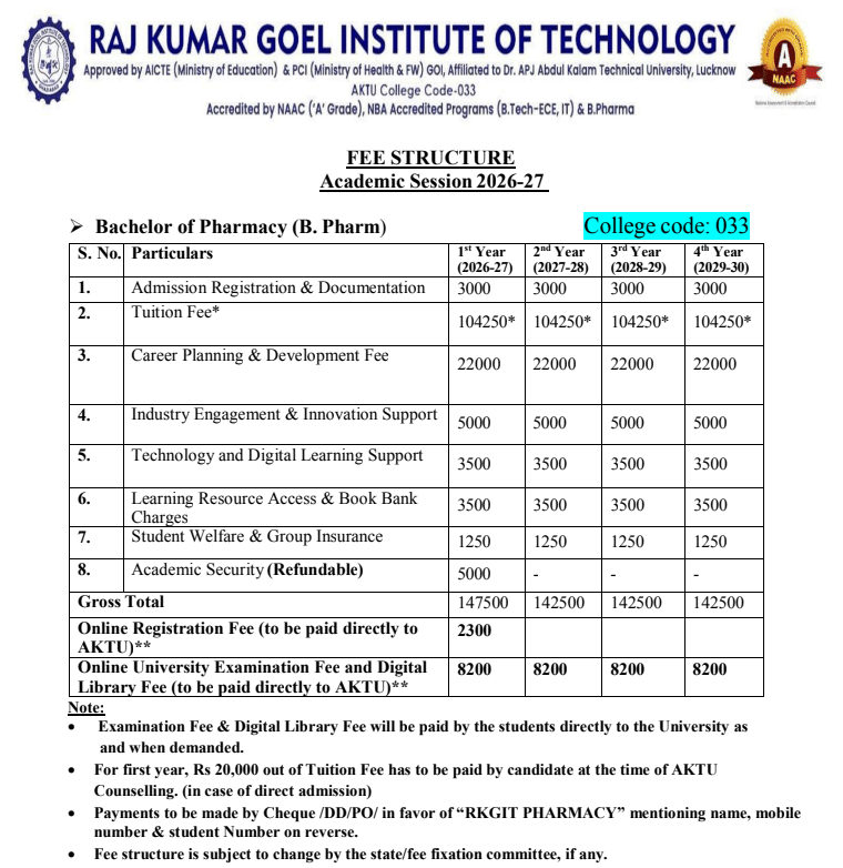 B.Pharma {Lateral} at RKGIT is a 3 Years Degree. The course is offered On Campus as a Full Time program. RKGIT B.Pharma {Lateral} First Year Fees is INR 1,35,000 for 2025.