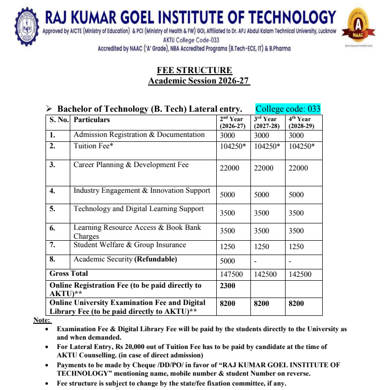 Earlier, B.Tech {Lateral} Information Technology fees at RKGIT was ₹ 4.02 Lakhs (in 2025) for the entire course duration. This shows a fee increase of ₹ 57,500 over the year.