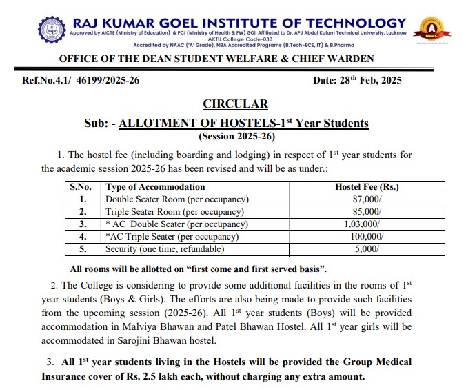 The hostel offers a variety of room options, including single, double, and triple-seater rooms, with annual fees starting at approximately INR 55,000. Air-conditioned rooms are available at higher rates, such as INR 80,000 for a single non-AC room and INR 97,000 for an AC room. Hostel facilities include 24/7 electricity and water supply, Wi-Fi, and basic furnishings like beds, tables, chairs, and almirahs. The infrastructure is generally good, with separate hostels for different years and genders.