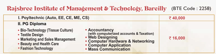 Earlier, Polytechnic Mechanical Engineering fees at Rajshree Institute of Management and Technology Bareilly was ₹ 1.2 Lakhs (in 2023) for the entire course duration. This shows that the fee has remained unchanged since 2023.