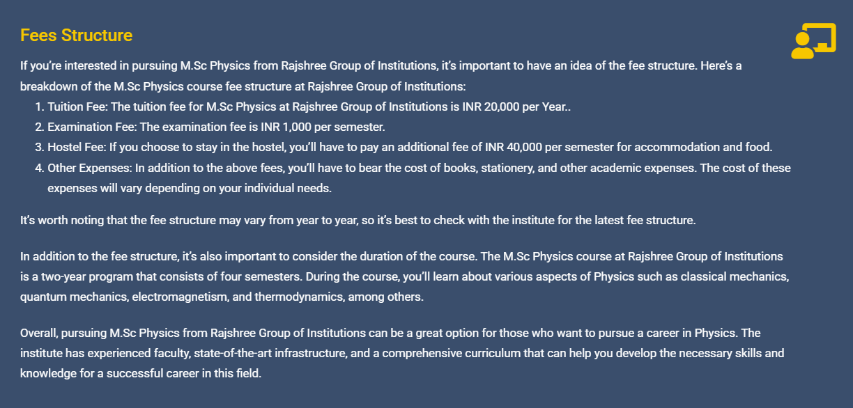M.Sc Physics Fees at Rajshree Institute of Management and Technology Bareilly covers a range of expenses, including tuition fee, course materials, and access to campus facilities.