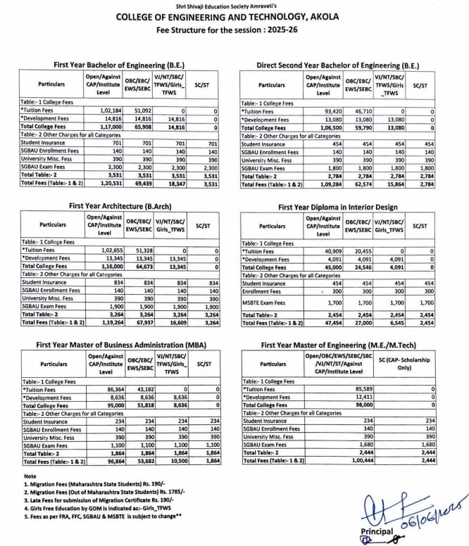 BE Civil Engineering at Shri Shivaji Education Society's College of Engineering and Technology Akola is a 4 Years Degree. The course is offered On Campus as a Full Time program. Shri Shivaji Education Society's College of Engineering and Technology Akola BE Civil Engineering First Year Fees is INR 1,17,000 for 2025.