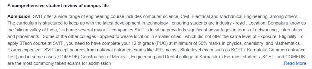 SVIT Bangalore offers B.E. as its flagship program in 7 different specializations with CSE and Information Science as the most preferred choice of students. Admission to B.E. program is based on scores in COMED-K or KCET exams followed by Karnataka state counselling.