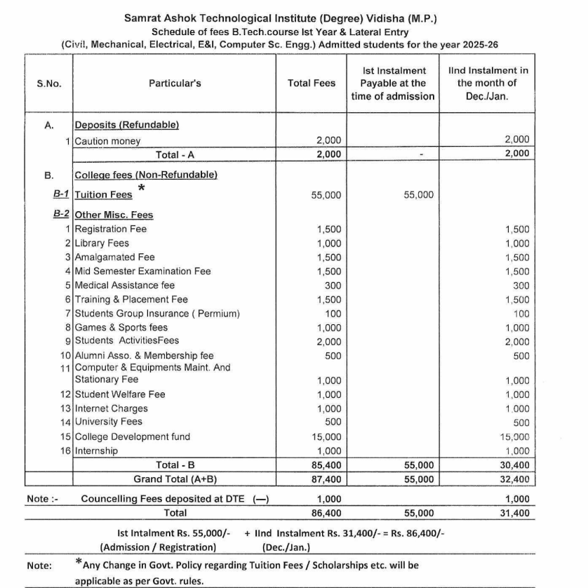 B.Tech {Lateral} Information Technology at SATI Vidisha is a 3 Years Degree. The course is offered On Campus as a Full Time program. SATI Vidisha B.Tech {Lateral} Information Technology First Year Fees is INR 87,400 for 2025.
