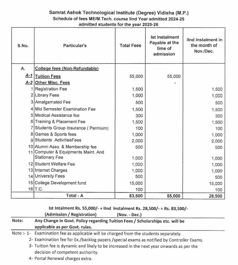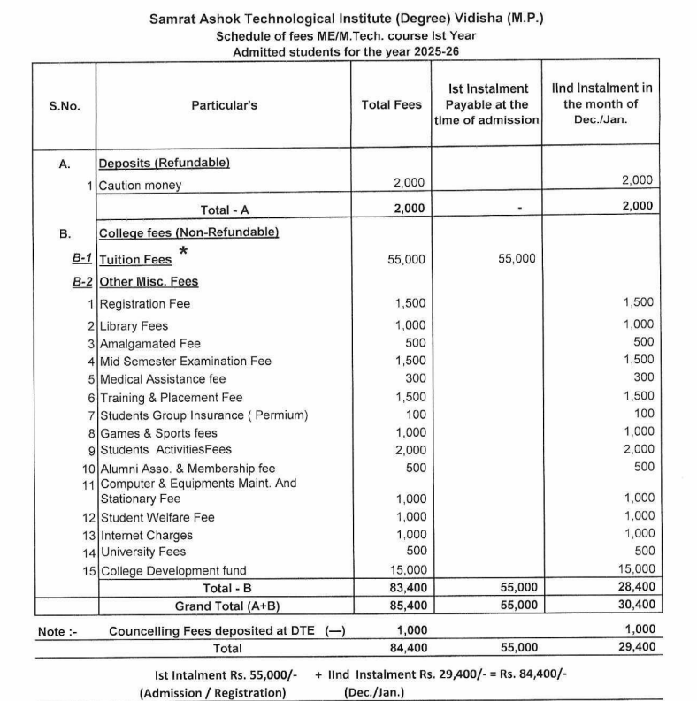 M.Tech Transportation Engineering at SATI Vidisha is a 2 Years Degree. The course is offered On Campus as a Full Time program. SATI Vidisha M.Tech Transportation Engineering First Year Fees is INR 78,500 for 2025.