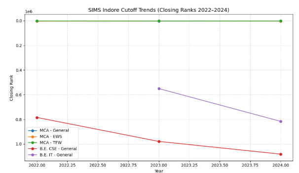 From 2022 to 2024, cutoff trends at SIMS Indore show rising competitiveness in the MCA program, especially in the General and EWS categories, where closing ranks improved significantly, e.g., General category moved from 3133 (2022) to 1921 (2024). The TFW category also maintained strong ranks across years. However, cutoff data for OBC, SC, and ST in 2024 is missing, limiting a full analysis.