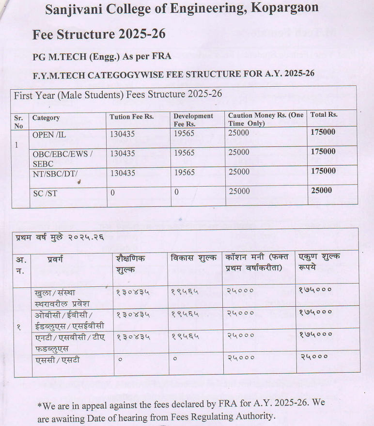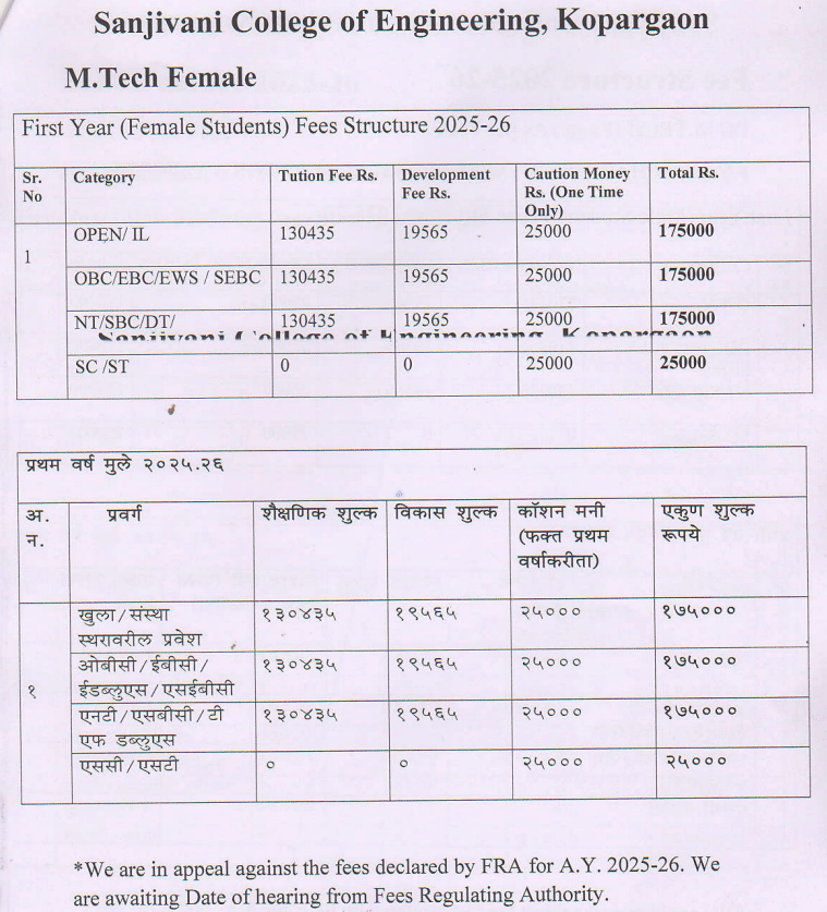 22 Dec, 2025 Sanjivani College of Engineering (An Autonomous Institute), Kopargaon has announced the M.Tech Design Engineering Fee Structure 2025-2026. The total academic fee is ₹ 3.25 Lakhs.