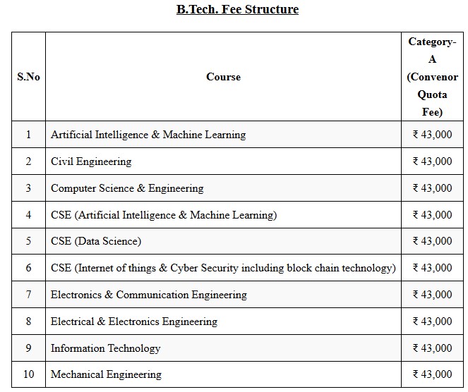 Additional costs include 20,000 INR for transportation, 5,000 INR for books, and a 2,100 INR exam fee per semester. Management quota students need to pay a one-time donation of 1 lakh INR for certain programs. The total annual cost for the 2020-2024 batch, excluding this donation, was roughly 75,000 INR.