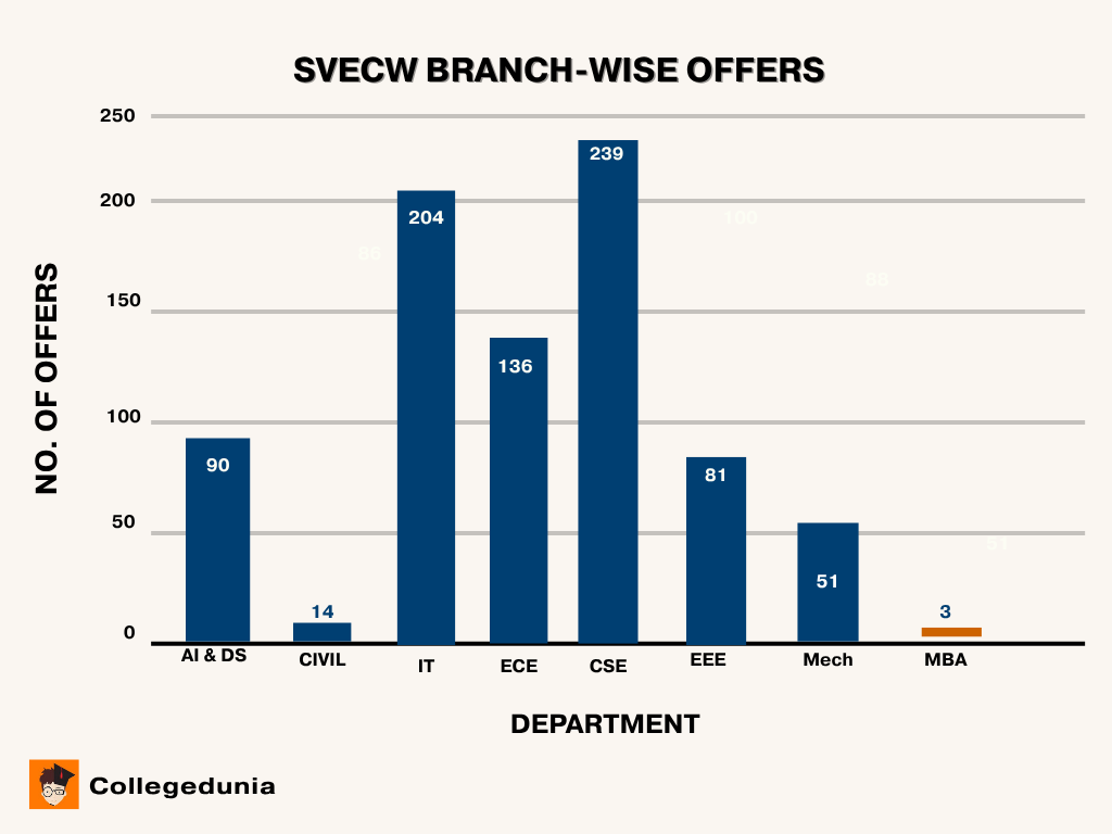 Ans. SVECW had 70 to 100 recruiting companies every year. In 2024, the highest package was INR 41.54 LPA offered by the Intuit company, while in 2023 the highest package offered was INR 41 LPA by Adobe. A total of 818 students got placed in the recruitment process in 2024, while in 2023 1464 students got placed in the recruitment drives.